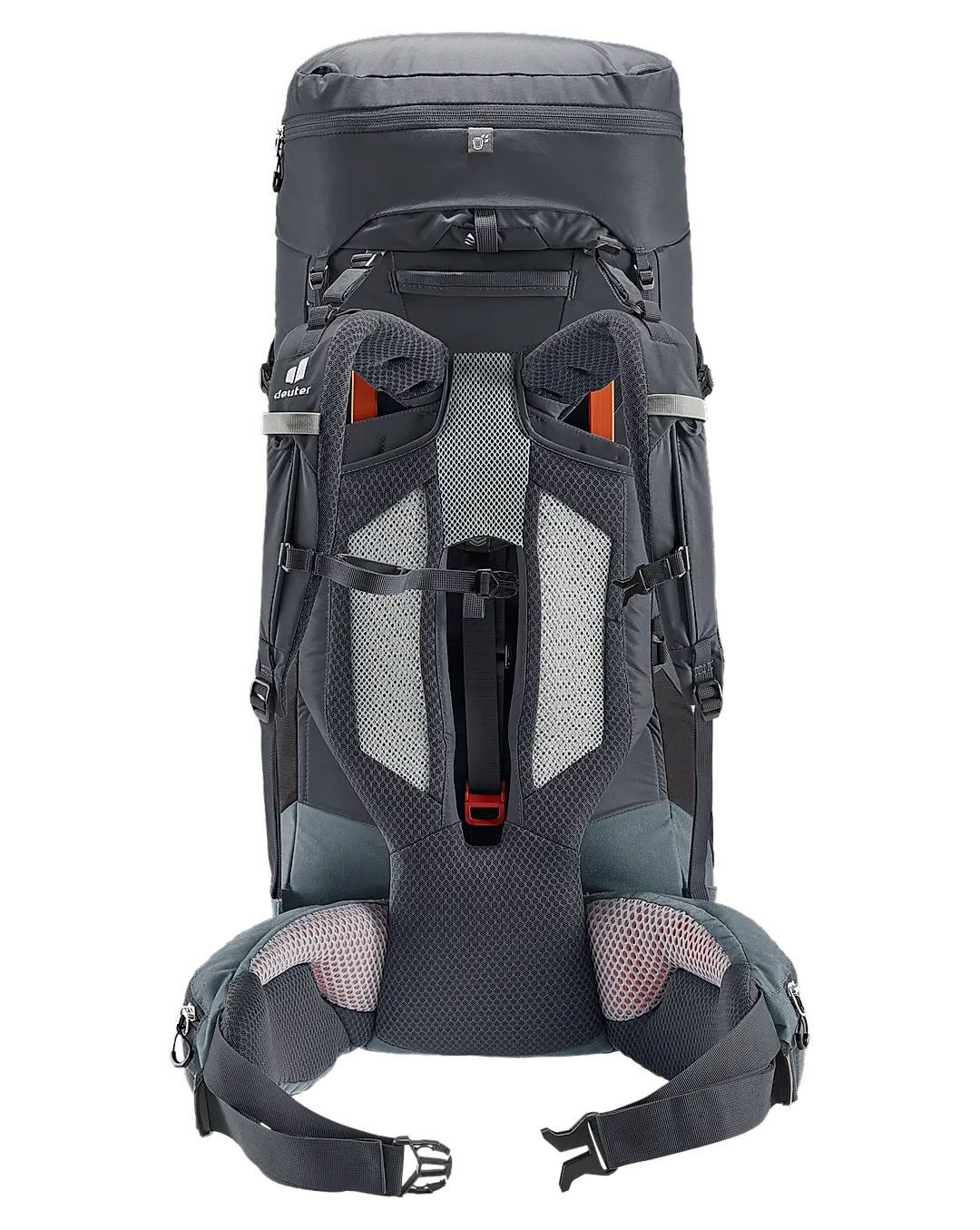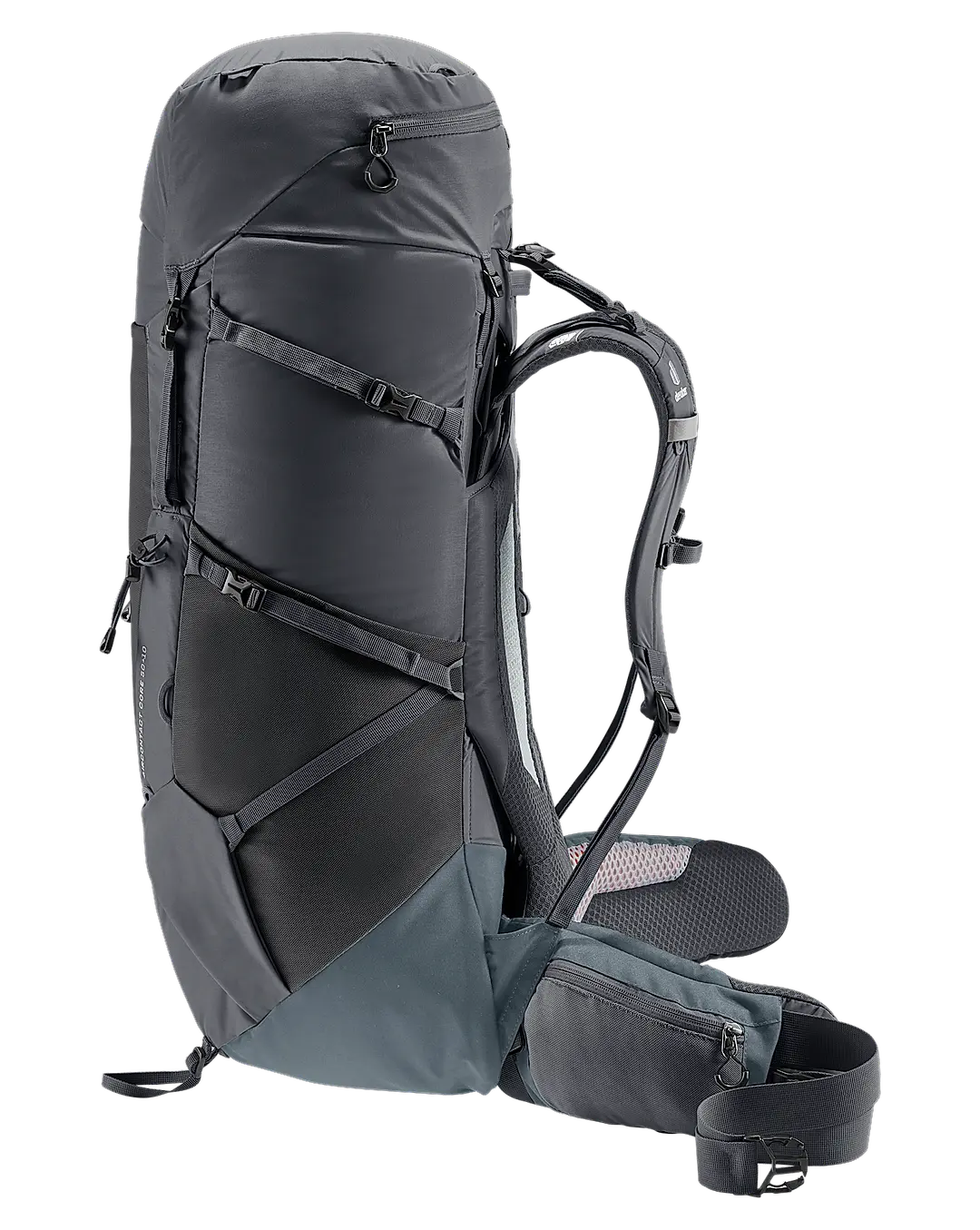 Its superior carry comfort is down to the deuter Aircontact back system with Air Spacer mesh and a large ventilation channel, plus ergonomic ActiveFit shoulder straps and an adjustable sternum strap. The Y-shaped frame, mobile hip fins and ergonomic lumbar pad combine to distribute the load effectively. A full-length, J-shaped zipper on the front makes contents easy to locate lower down in the main compartment. While large, detachable hip fin pockets (3 L) provide extra storage and keep items within reach. A zip-out 1.5-liter bottle holster also lets you hydrate on the move.